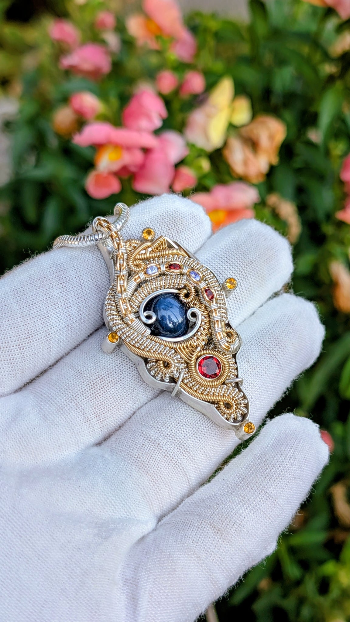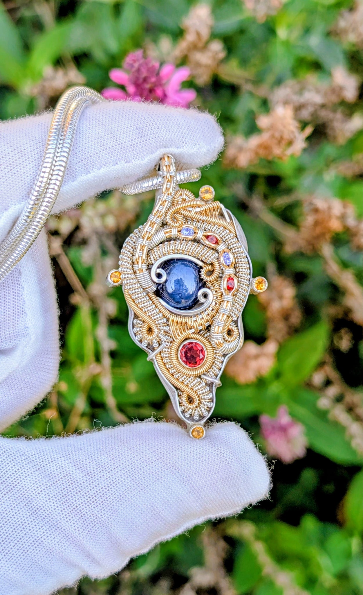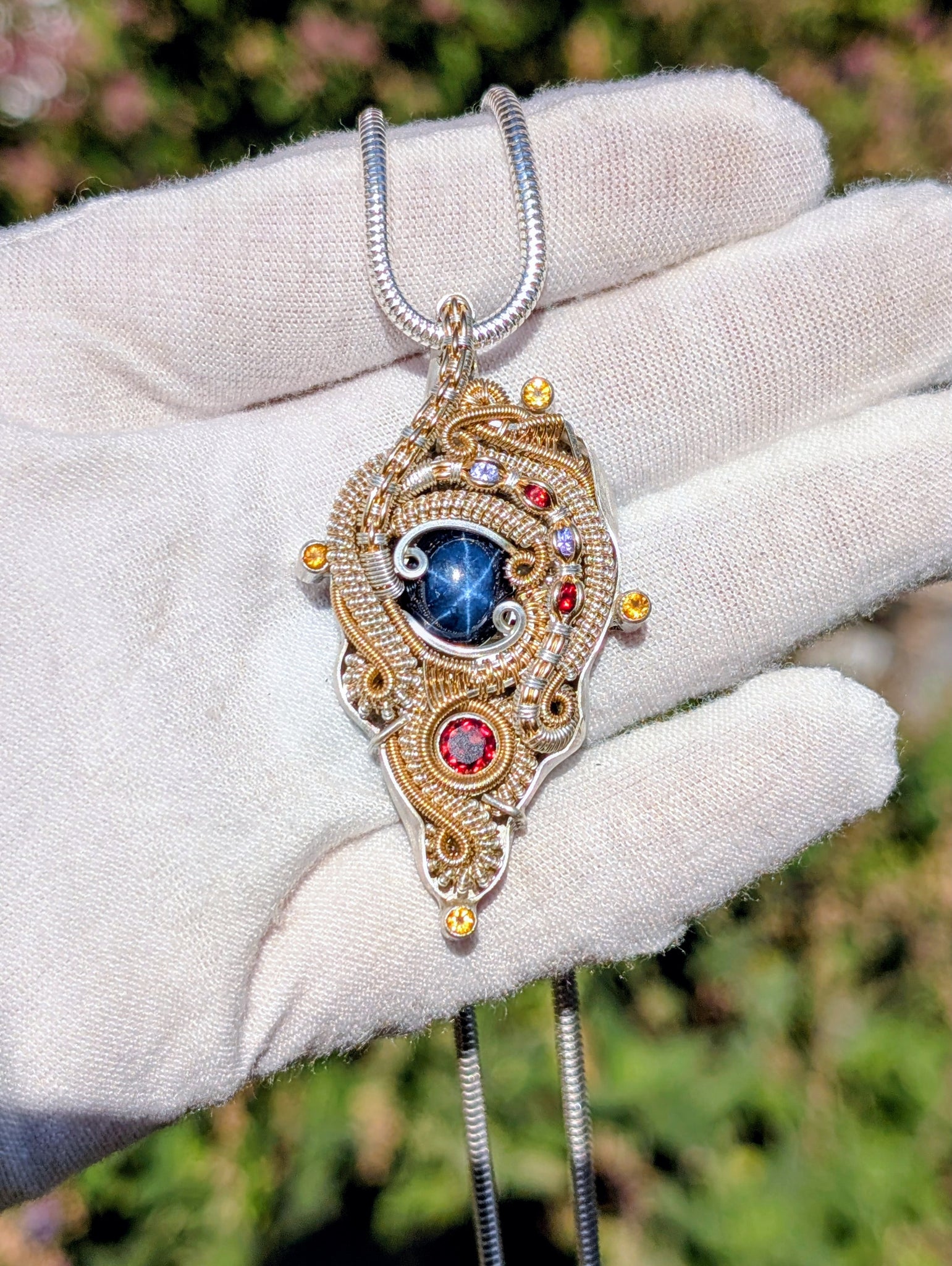 This pendant features an 8.21 ct star sapphire, 3 garnets, 2 tanzanites, and 4 citrine gemstones made in sterling silver and 14k gold fill. The backplate is sterling silver that is hand engraved with an original scrollwork design that I made.