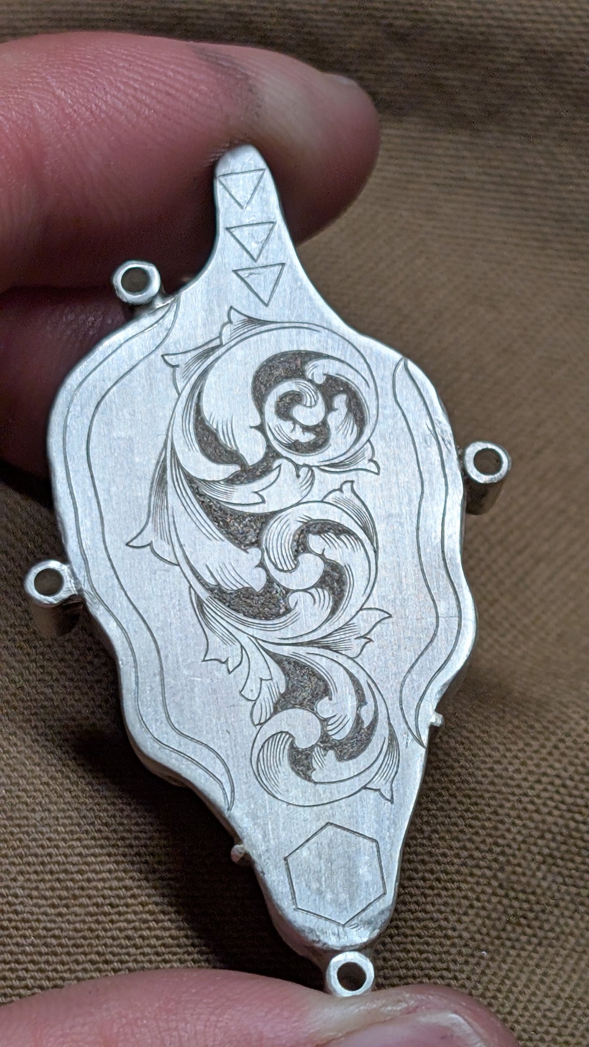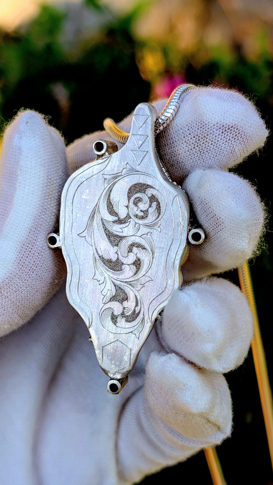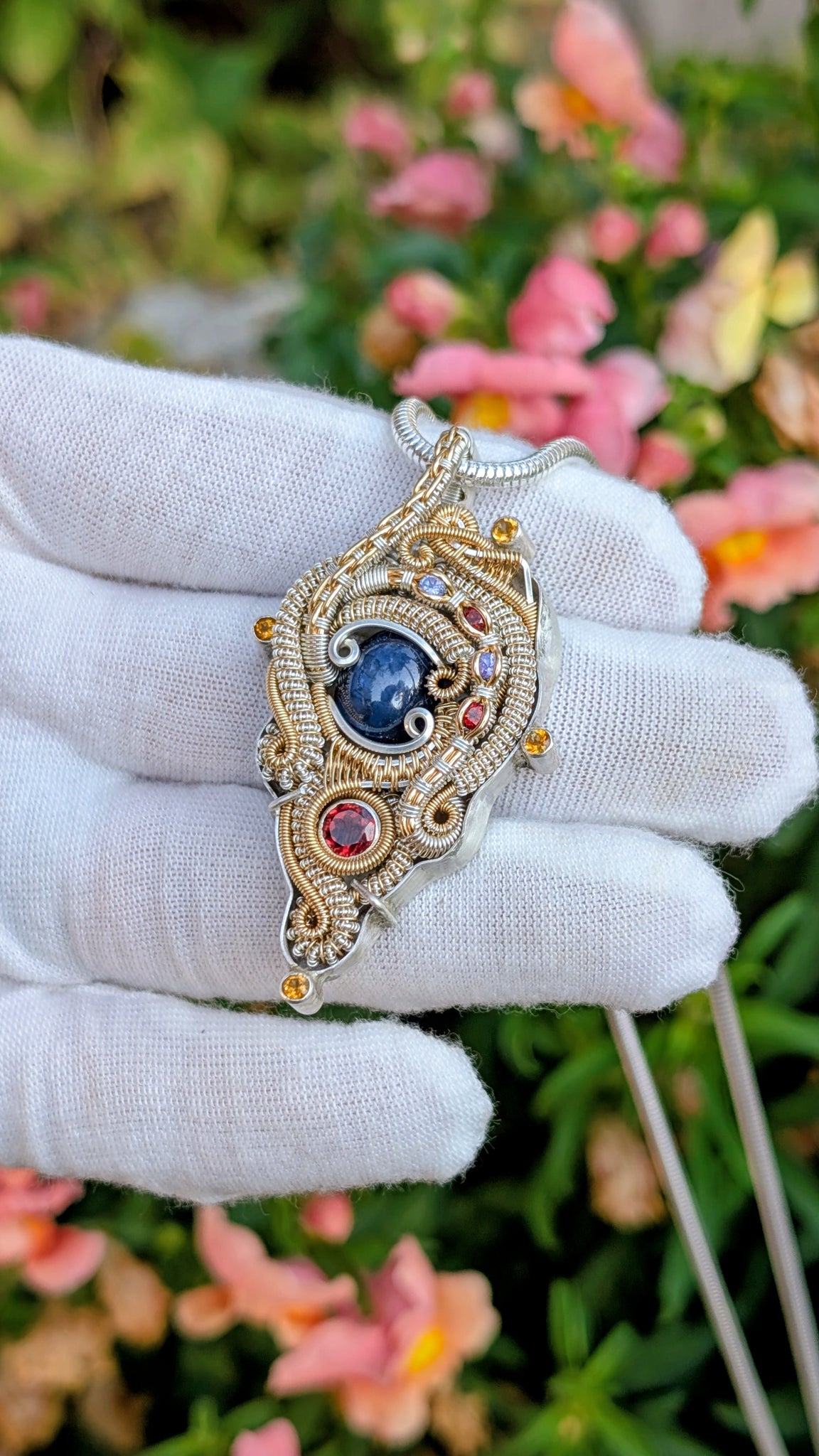 This pendant features an 8.21 ct star sapphire, 3 garnets, 2 tanzanites, and 4 citrine gemstones made in sterling silver and 14k gold fill. The backplate is sterling silver that is hand engraved with an original scrollwork design that I made.