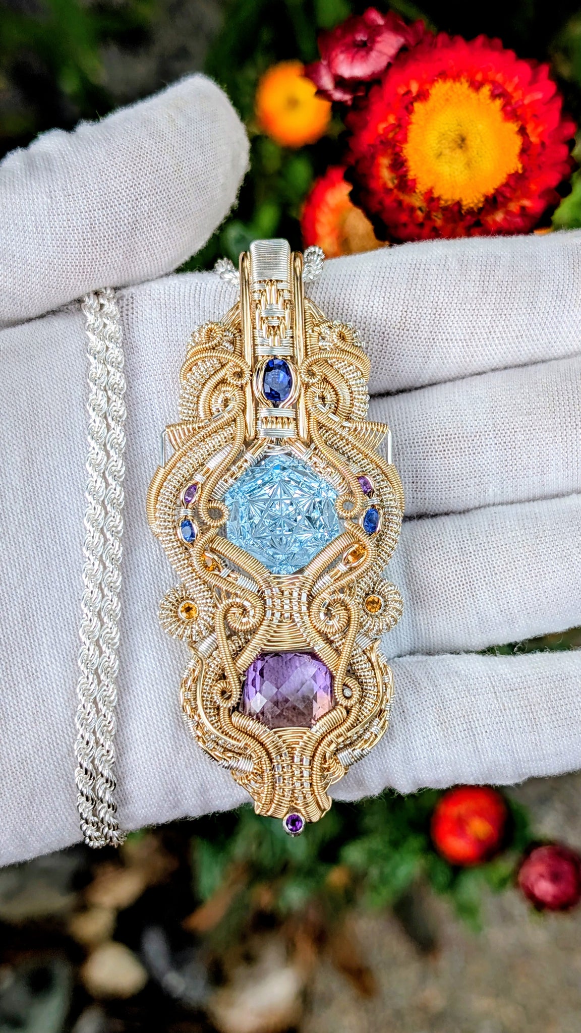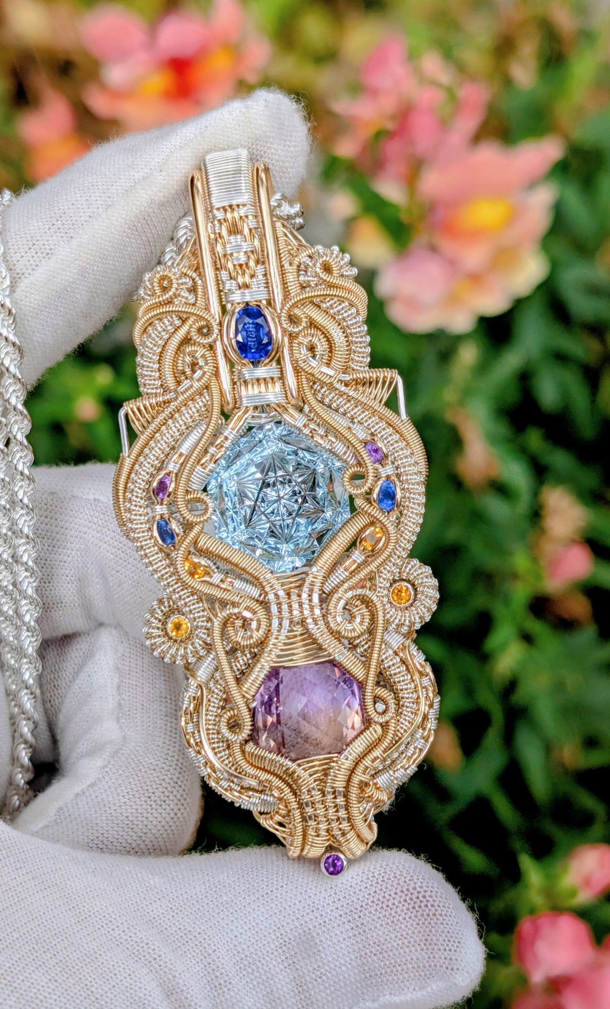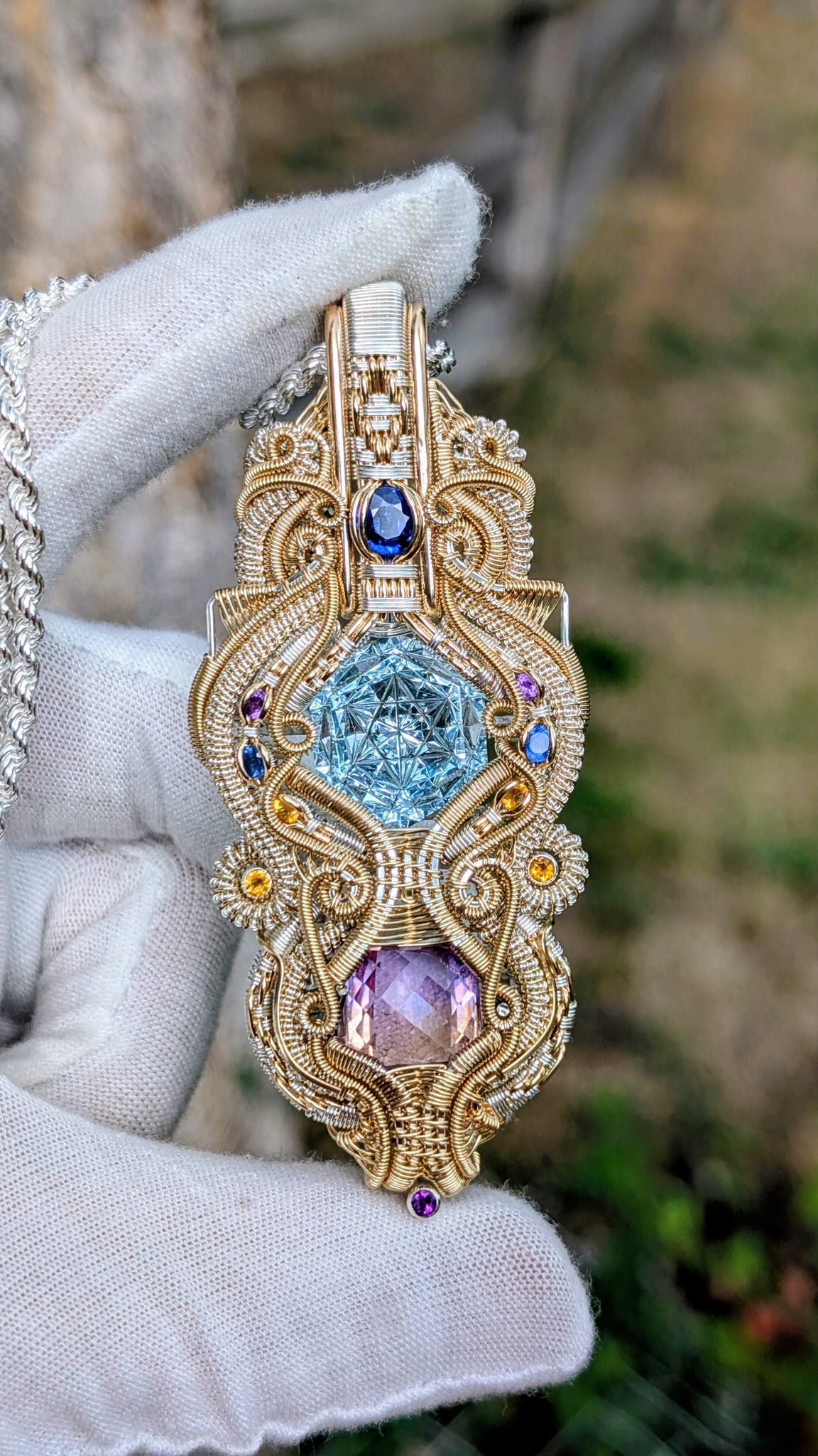 This pendant features a 17.63 ct Swiss blue topaz Merkaba gemstone, a 10.52 ct ametrine, a .86 ct royal blue sapphire gemstone, 3 amethysts, 2 kyanites, and 4 citrines wrapped in sterling silver and 14k gold fill.