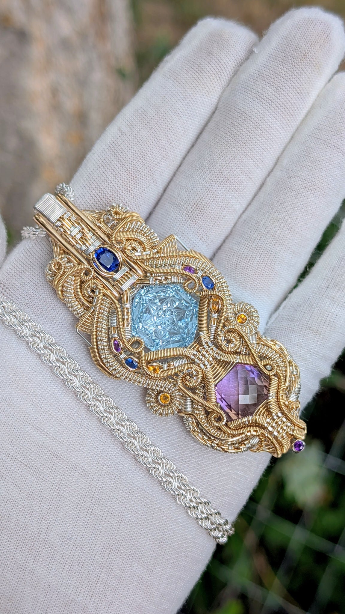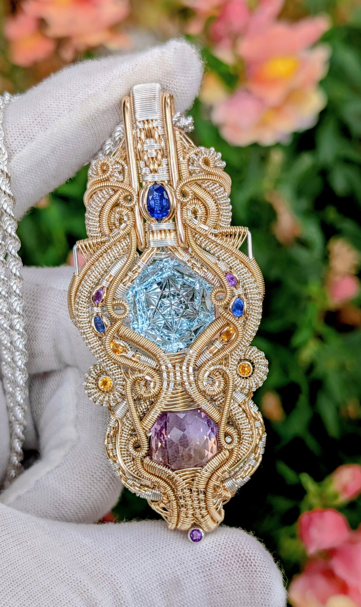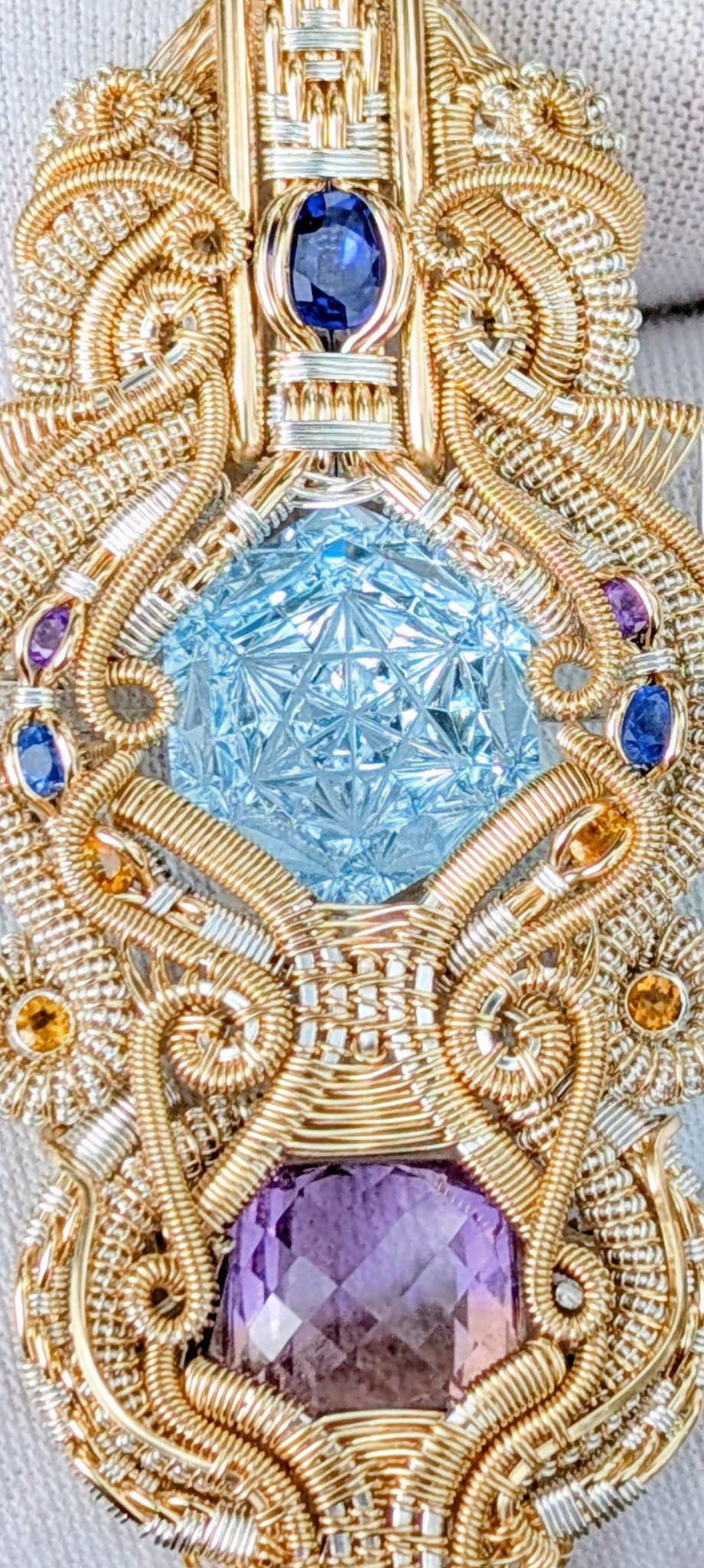 This pendant features a 17.63 ct Swiss blue topaz Merkaba gemstone, a 10.52 ct ametrine, a .86 ct royal blue sapphire gemstone, 3 amethysts, 2 kyanites, and 4 citrines wrapped in sterling silver and 14k gold fill.