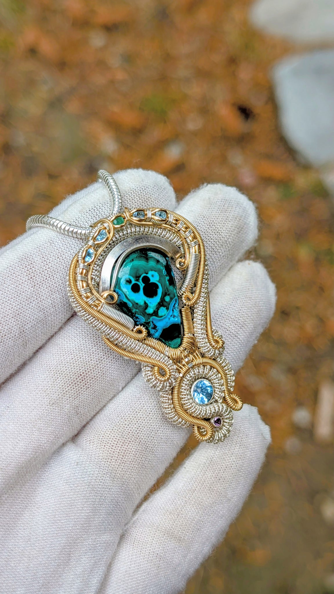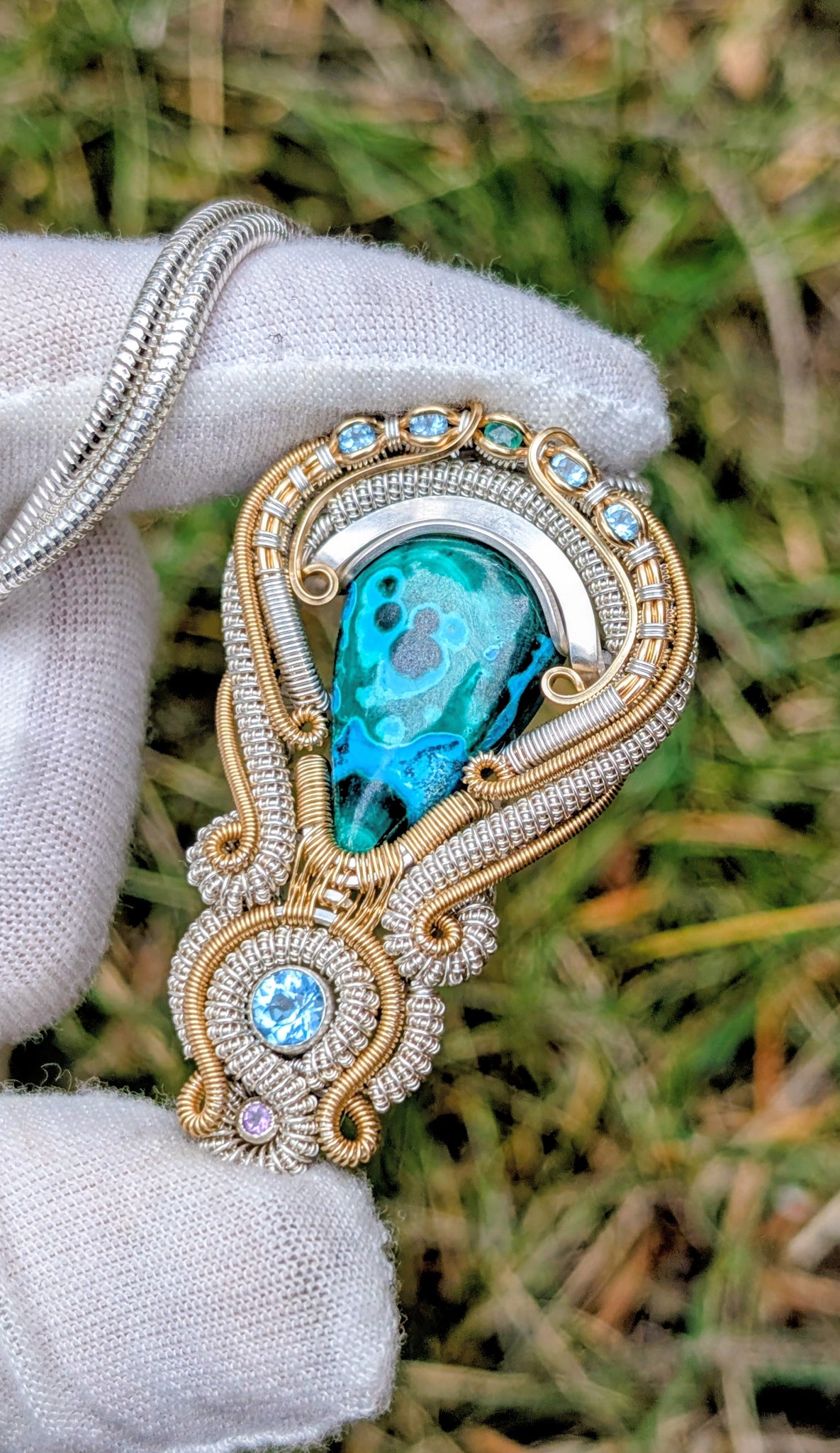 This pendant features a 17 ct chatoyant chrysocolla malachite, Swiss blue topaz, amethyst, emerald, and 4 Swiss blue topaz gemstones wrapped in sterling silver and 14k gold fill.