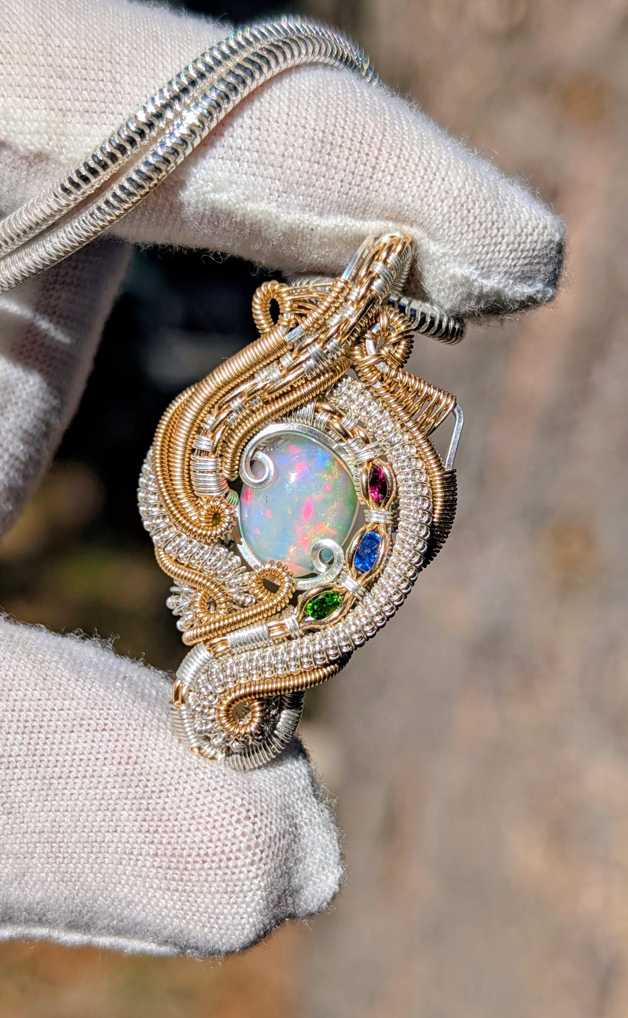 This pendant features a 2.89 cr Ethiopian opal, rhodolite garnet, kyanite, and chrome diopside wrapped in sterling silver and 14k gold fill.