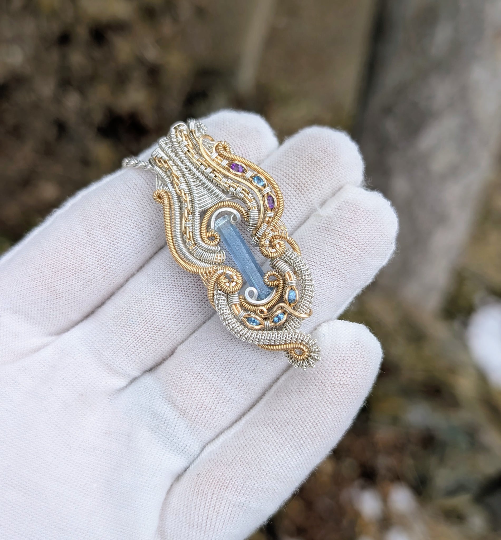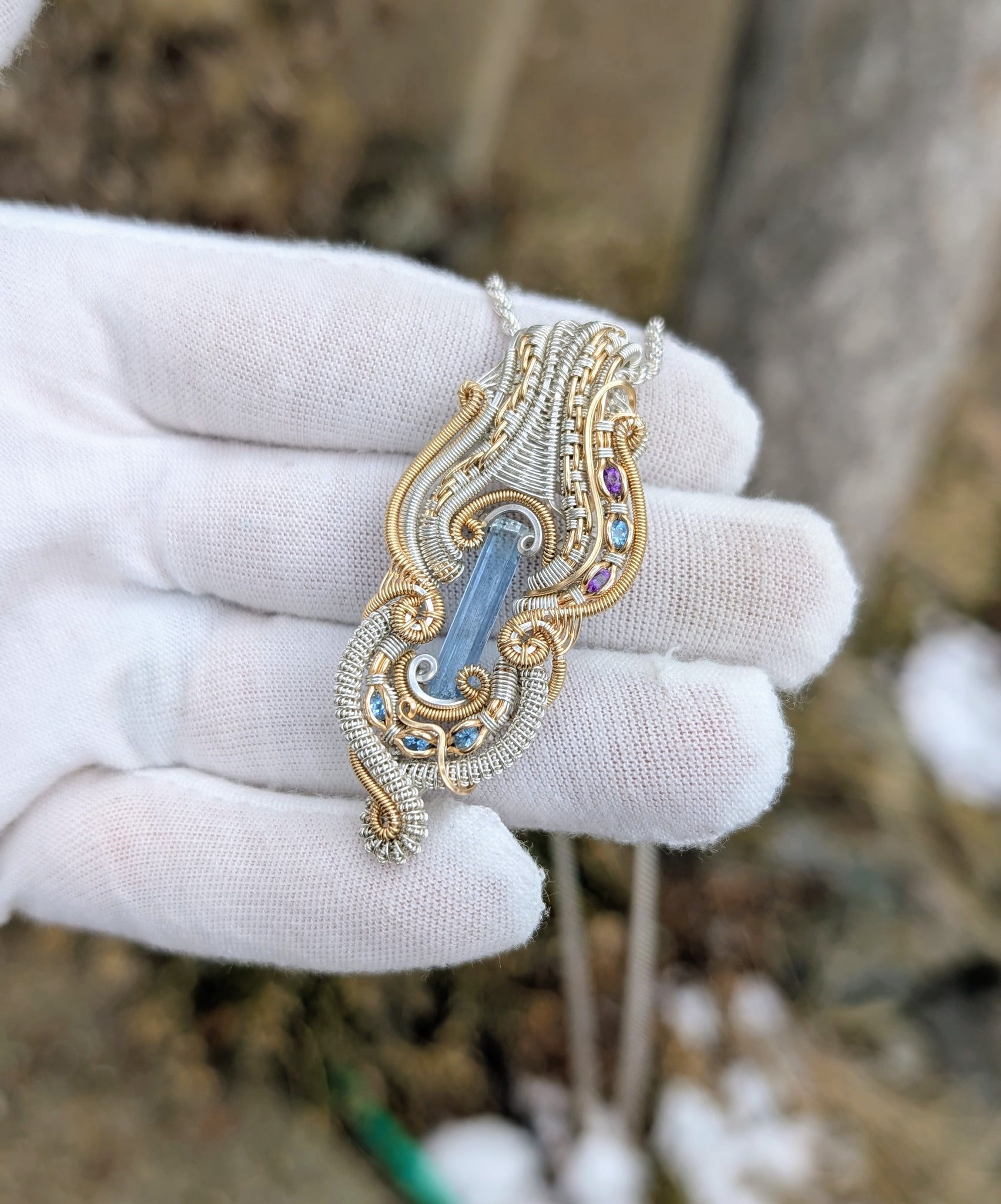 This pendant features a Vietnamese aquamarine crystal accompanied by 4 aquamarine gemstones and 1 amethyst gemstone wrapped in sterling silver and 14k gold fill.