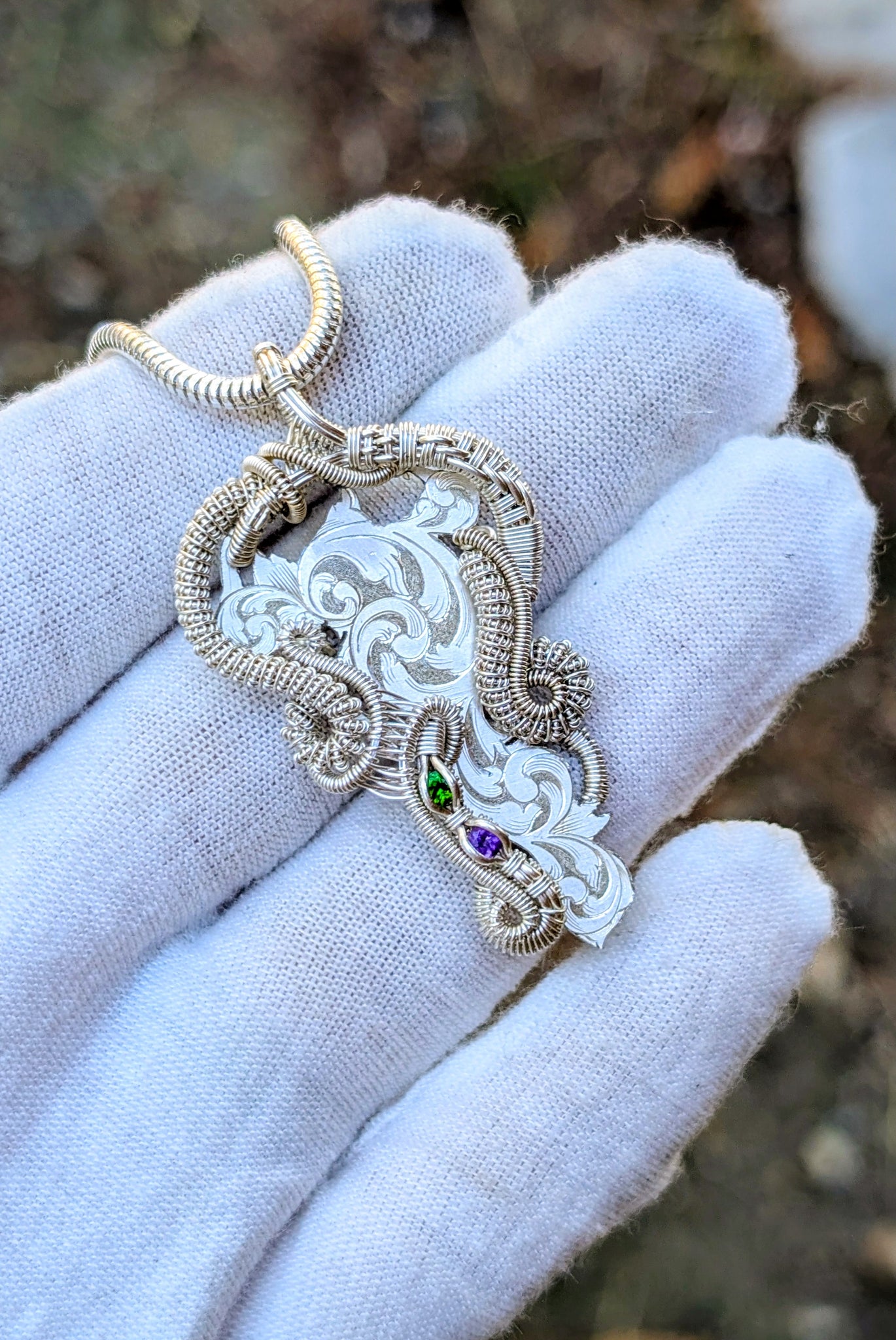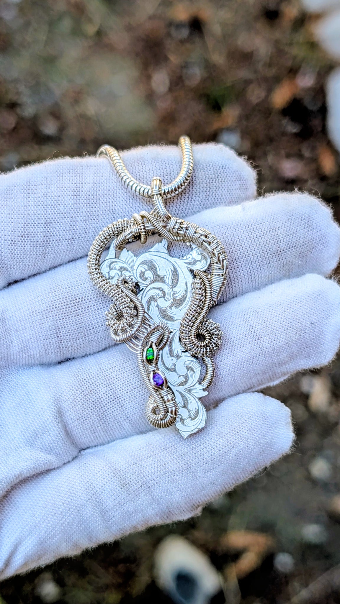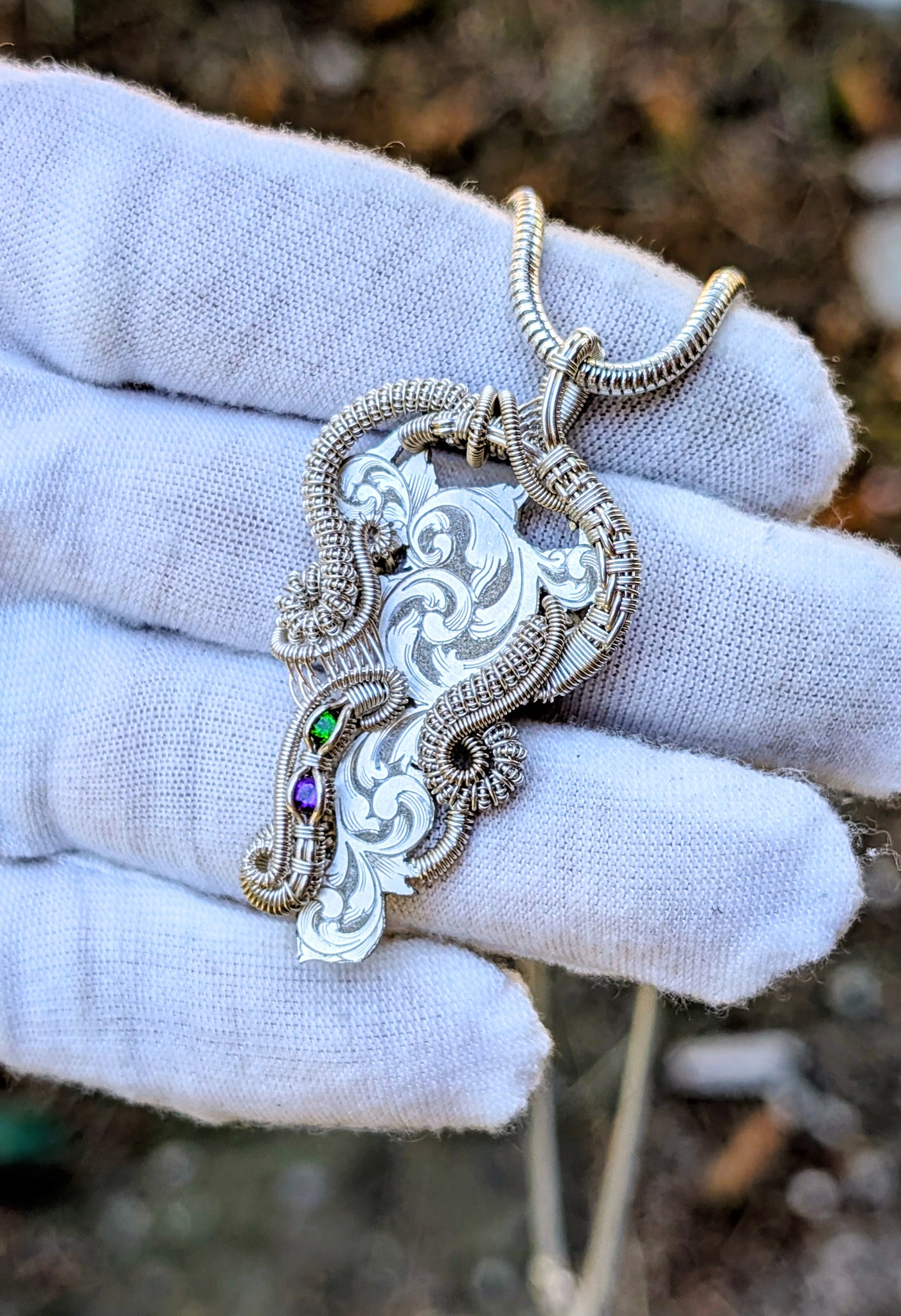 This pendant features an amethyst and a chrome diopside gemstone, beautifully wrapped in sterling silver. Intricate hand-engraved scrollwork embellishes the sterling silver frame, adding a touch of timeless artistry and detail that makes this pendant truly one-of-a-kind.
