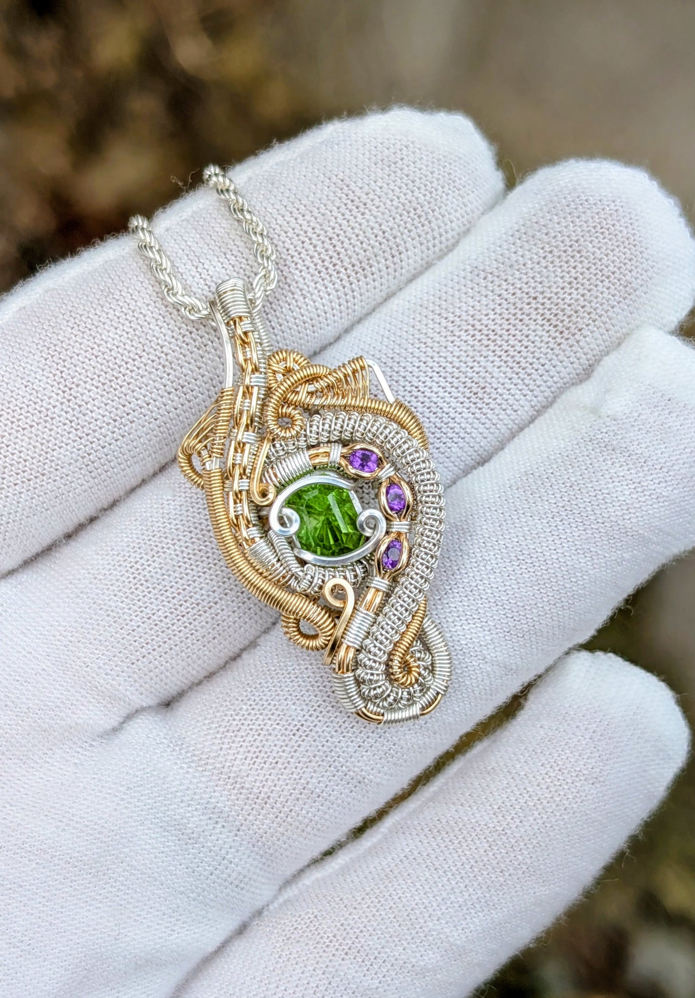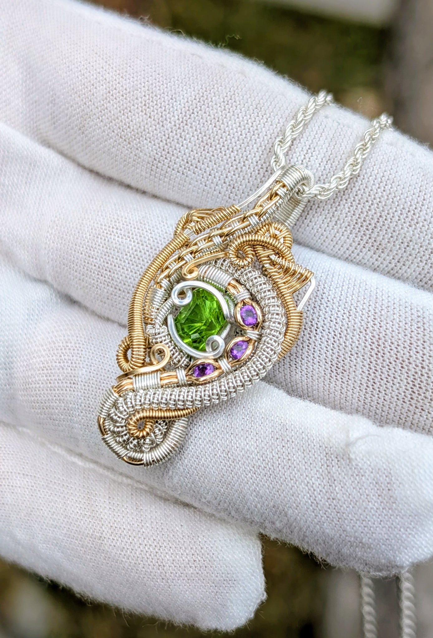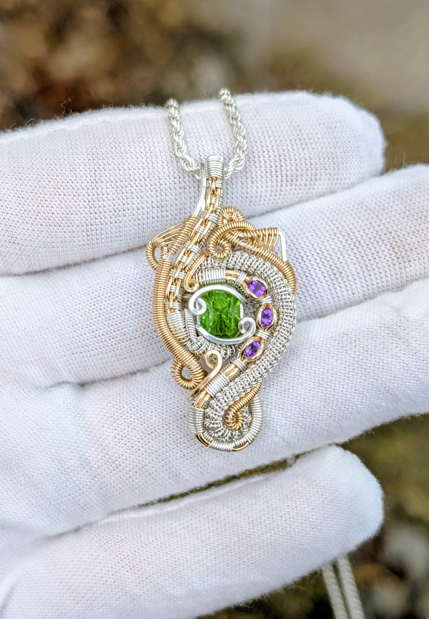 This pendant features a 2ct peridot gemstone and 3 amethyst gemstones wrapped in sterling silver and 14k gold fill.