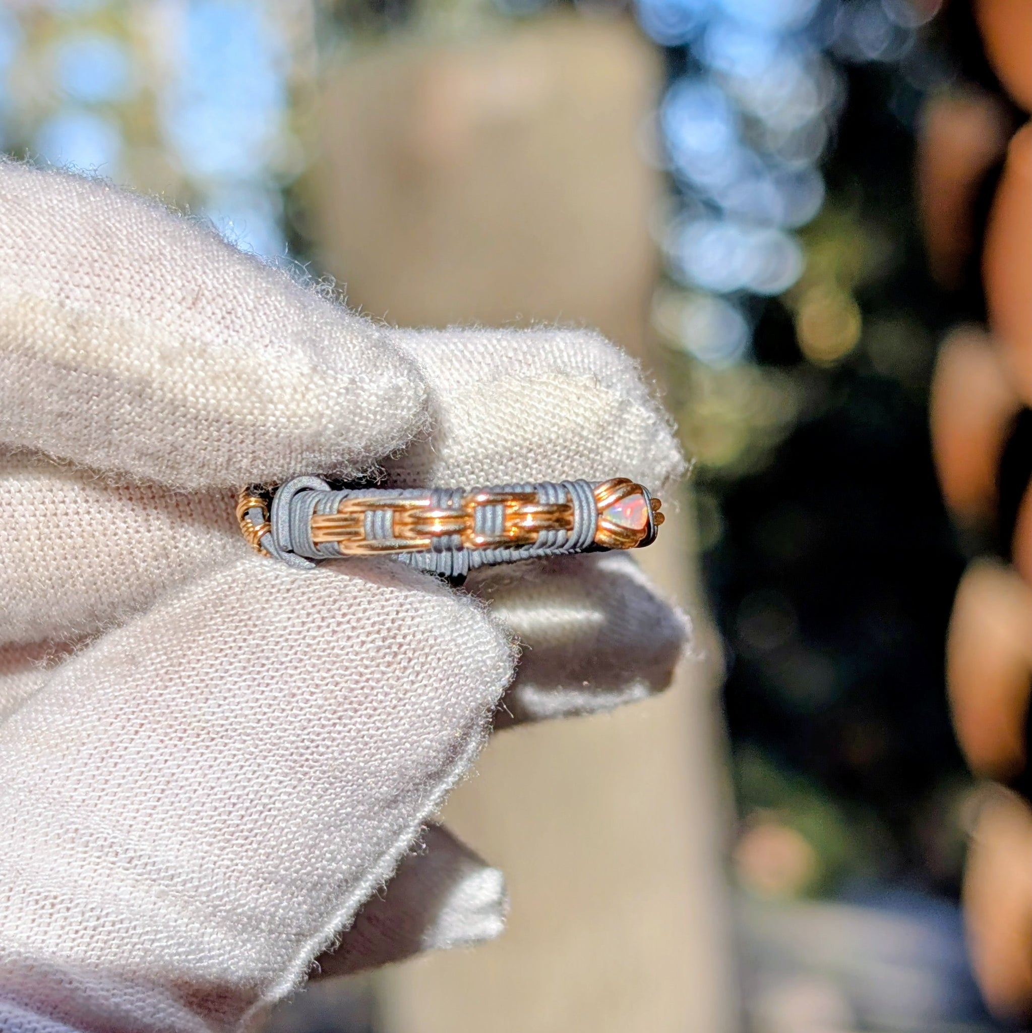 This ring features two Ethiopian opals wrapped in oxidized sterling silver and 14k gold fill.