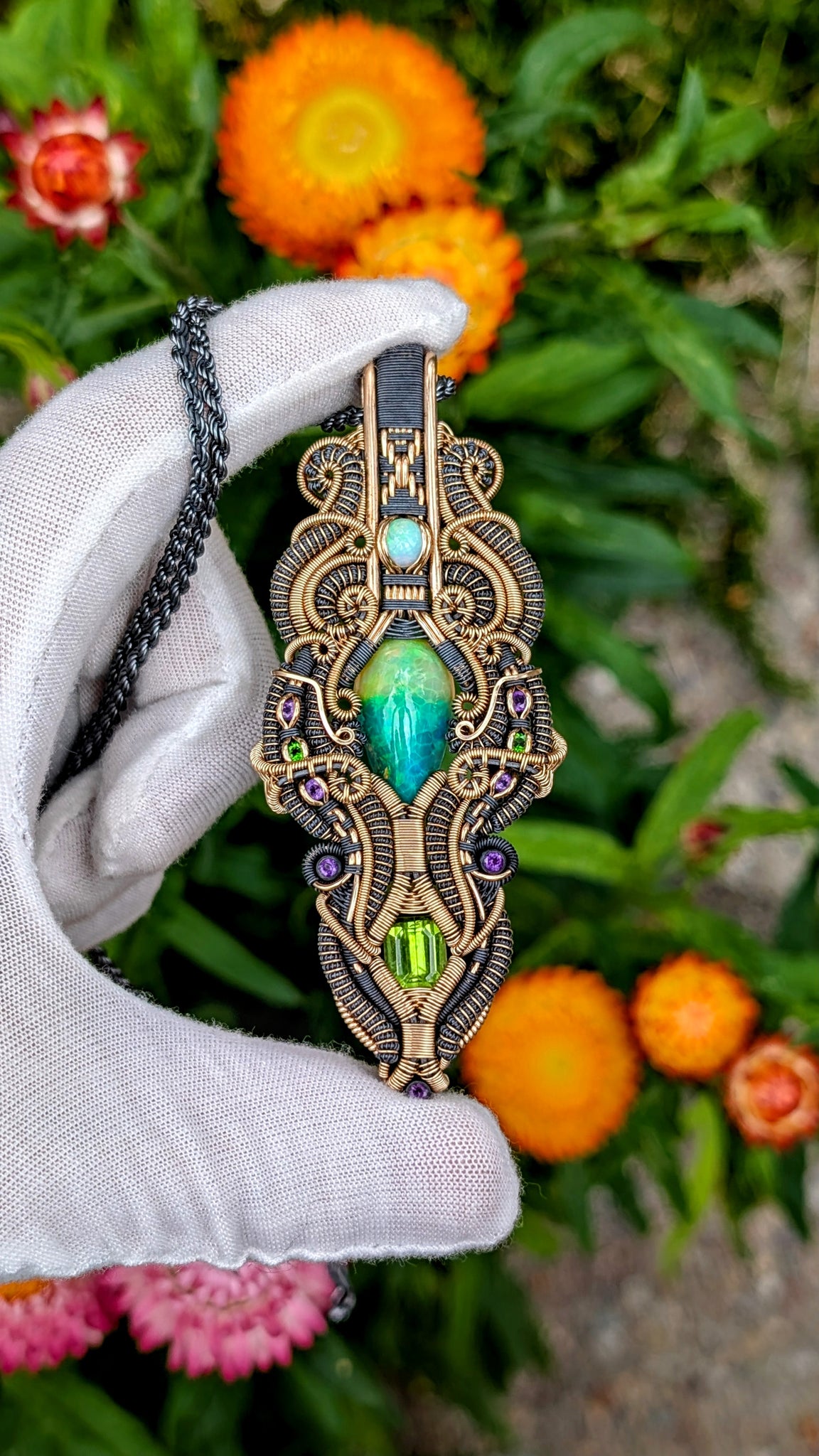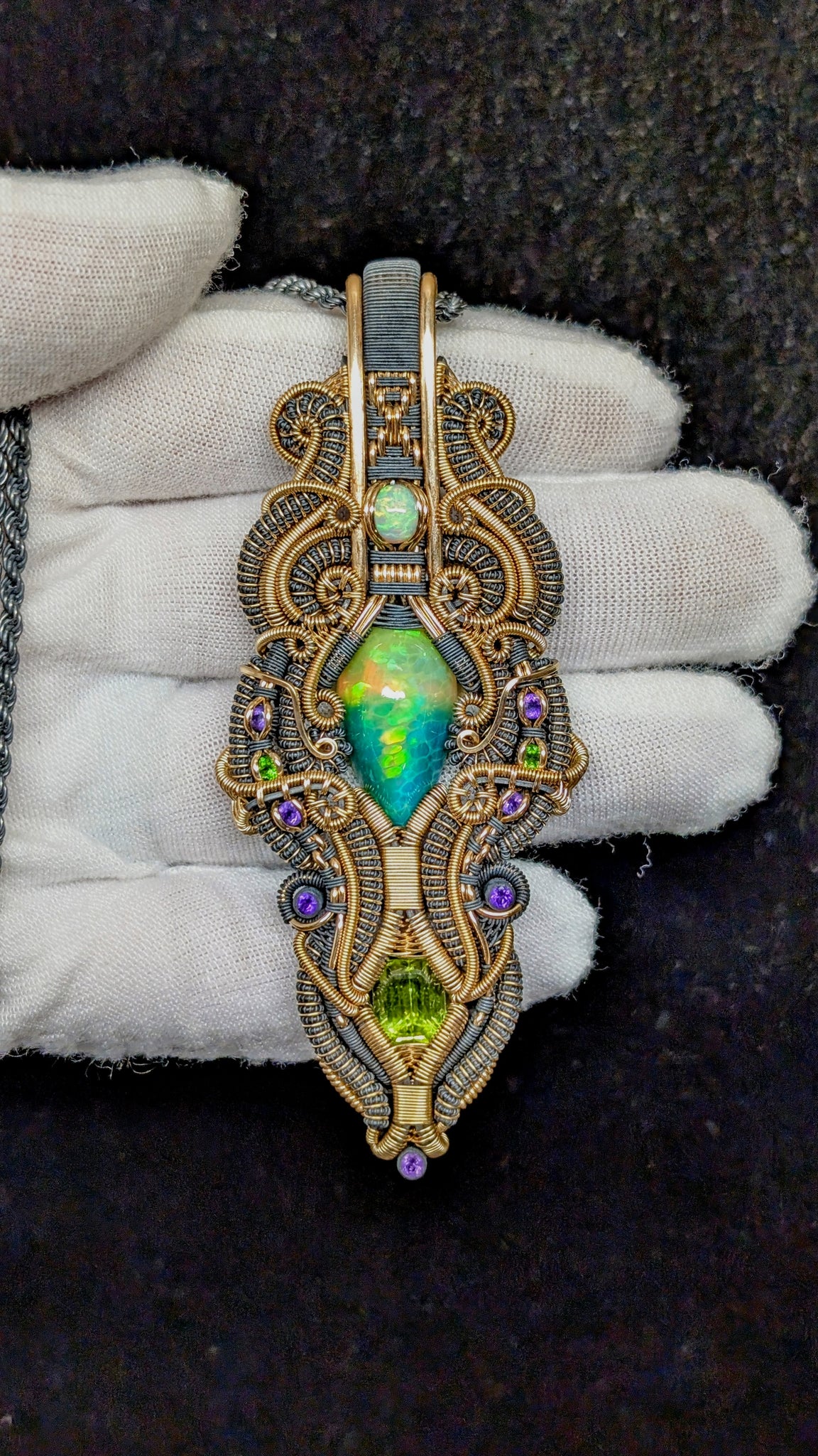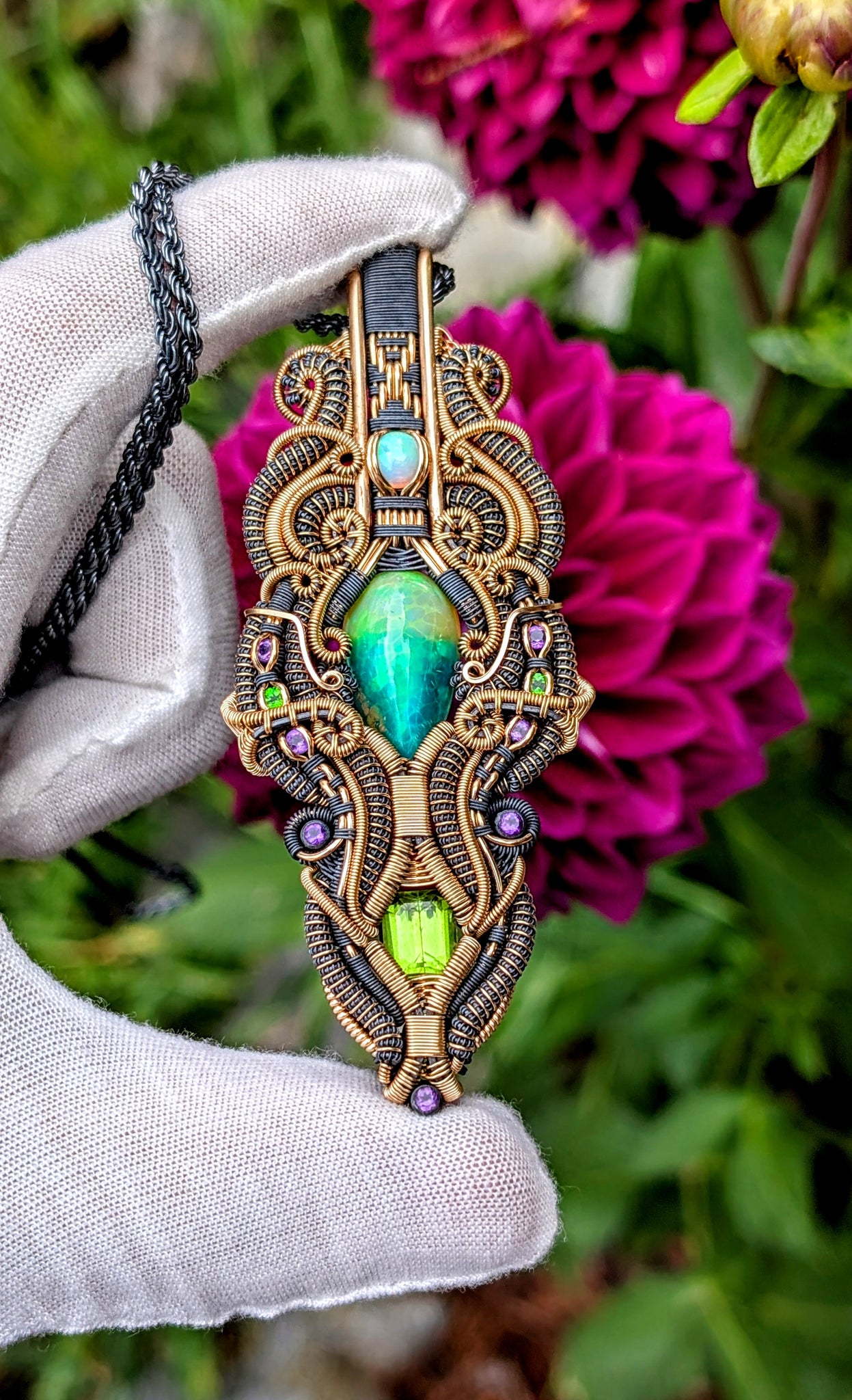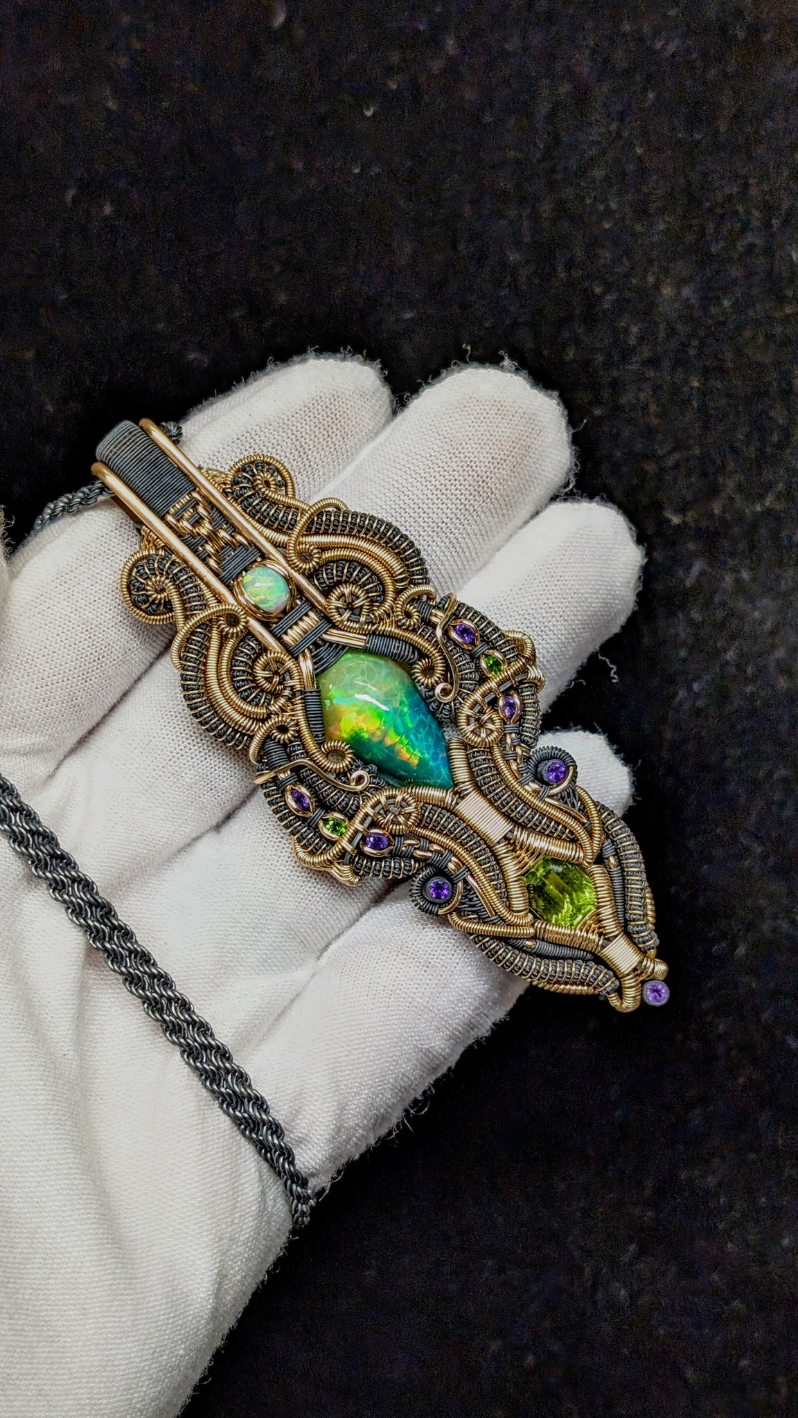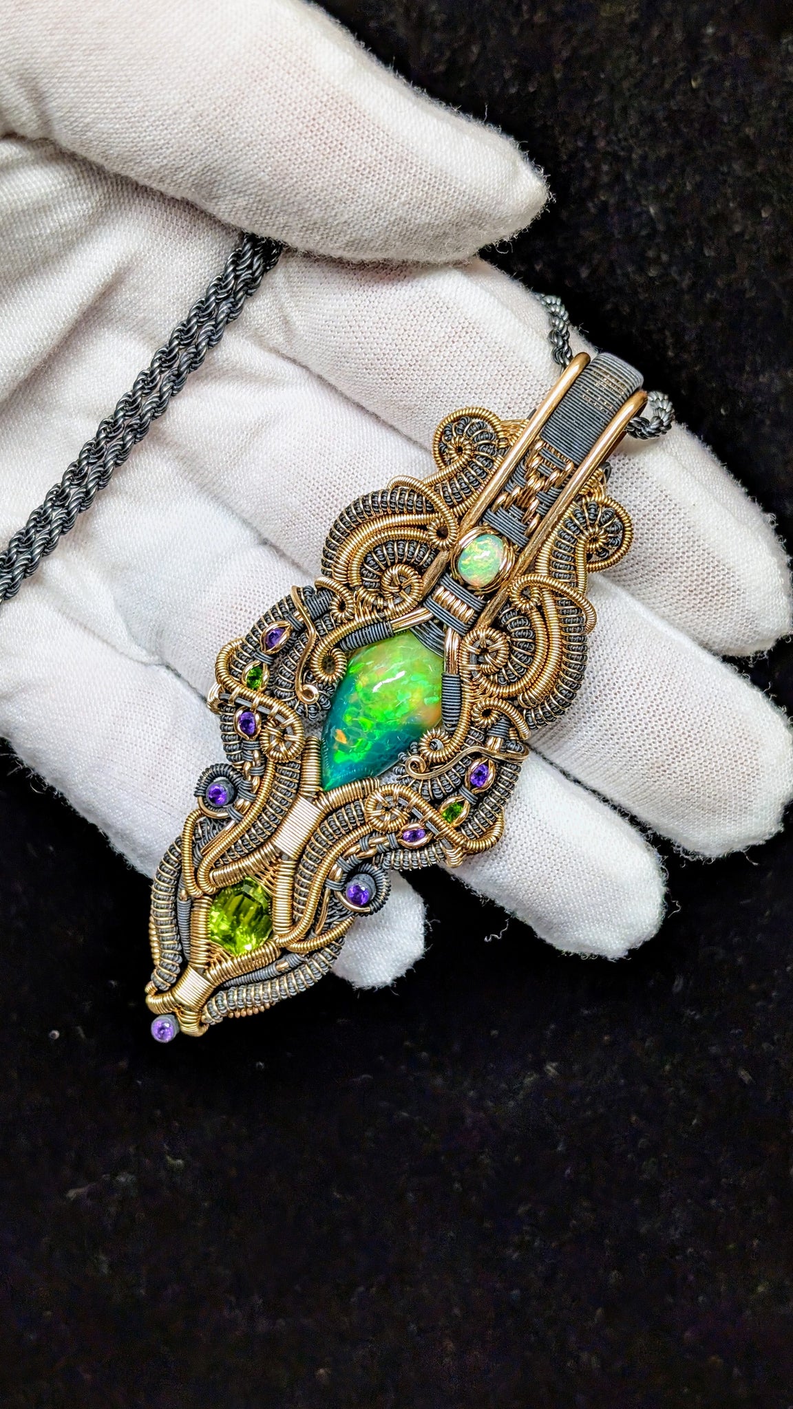This pendant features an outstanding 9.3 ct honeycomb pattern black Ethiopian opal, a 3.16 ct peridot gemstone below it, a .63 ct Ethiopian opal on top in the bail, 7 amethyst gemstones, and 2 chrome diopside gemstones wrapped in oxidized sterling silver and 14k gold fill.